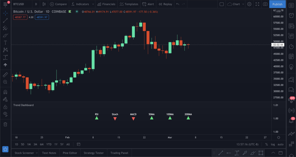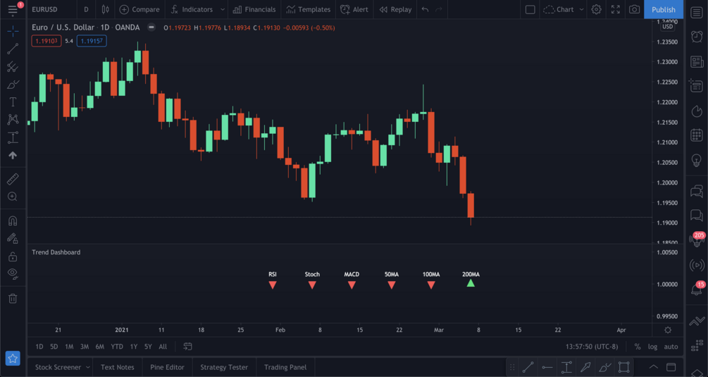 This TradingView indicator will automatically show you the strength of the current market by analyzing the RSI, Stochastic, MACD, 50MA, 100MA, and 200MA all at once.