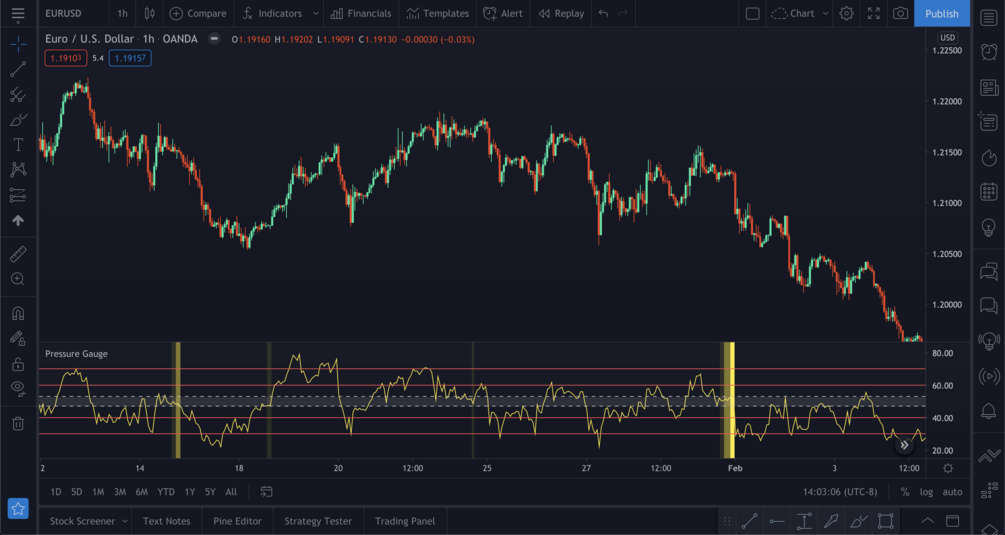 The Pressure Gauge TradingView indicator uses the RSI and our custom-coded algorithm to find the places of extreme pressure in the market. These places are identified with a yellow mark. Watch the video to see what each shade of yellow means. This indicator can be used to get into HUGE trades since there is so much exploding pressure behind these moves.